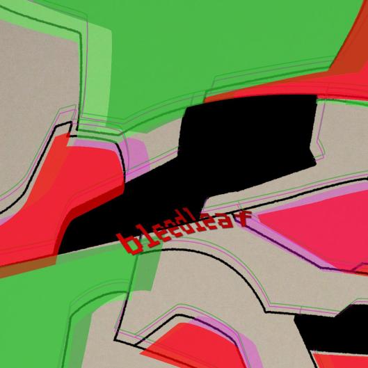 The red and green shapes were coloured at 1/3 transparency using for outline two other, different scaled rotations of the same lines that are not visible in the final image. Three separate layers of red are used, one purple, and two of each shade of green. Every one was individually ordered over, under, and in between all the other ones. Even squeezed them in sideways in a couple spots.