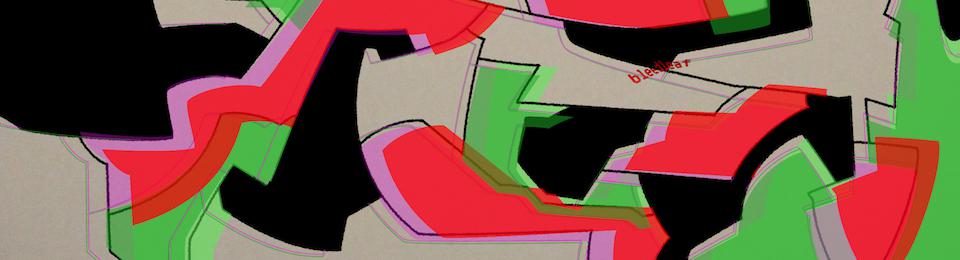 The lines from the layer with the thicker black tracing follow those that are drawn on the paper used here as background, and match the thinner ones on the layer above it where the black areas were filled in. The green and purple lines are both separate scaled rotations of these same lines, at about 2/3 opacity each on their own layer, placed in between the layers with black shapes and thicker tracing that have no transparency.